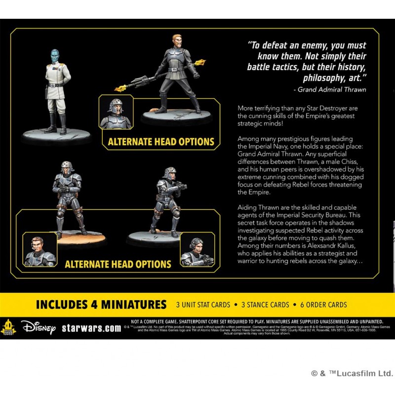 Thrawn est assisté dans sa mission par des agents qualifiés du Bureau de Sécurité Impériale. Cette organisation opère dans l'ombre pour enquêter sur les activités suspectées rebelles avant de se rendre sur place pour les anéantir. L'un de ces agents, Alexsandr Kallus, utilise ses talents de stratège et de guerrier pour traquer les rebelles à travers la galaxie.