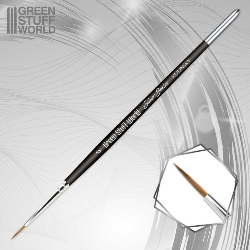 J'en profite !Gamme de pinceaux Kolinsky Green Stuff World, SILVER SERIES. Fabriqués à la main avec un manche en bois de haute qualité et une pointe en poils naturels Kolinsky, fixés par une virole en laiton, ces pinceaux offrent une expérience de peinture fluide et précise, idéale pour les amateurs et les experts.