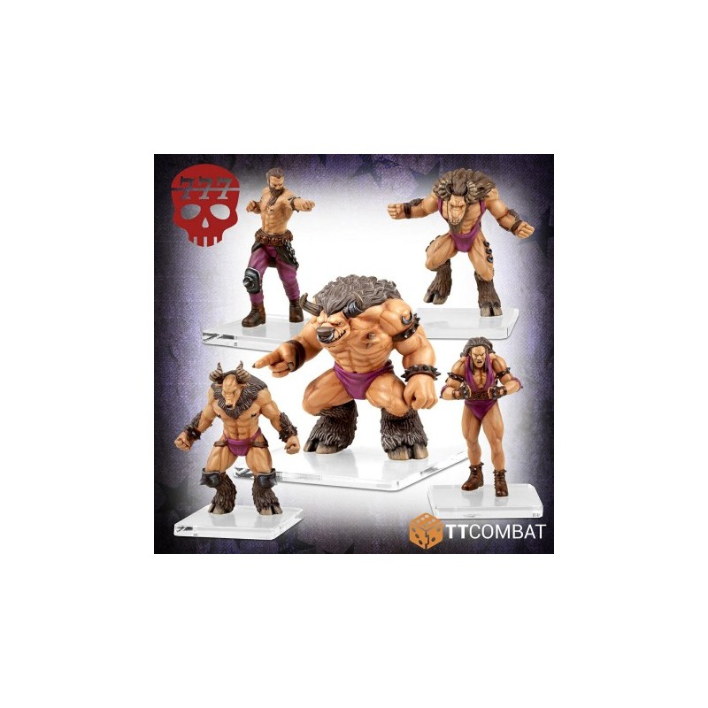 Cette boîte contient un exemplaire de chaque : Goatman Brawler, Goatman Grappler, Barbarian Brawler, Barbarian Grappler, et Minotaure. Toutes les figurines en résine sont fournies non peintes et non assemblées, avec des cartes de profil de personnage uniques et des socles en acrylique transparent. Notez que les socles en acrylique transparent peuvent être protégés par un film pelable coloré. Les figurines sont fournies avec des socles carrés.